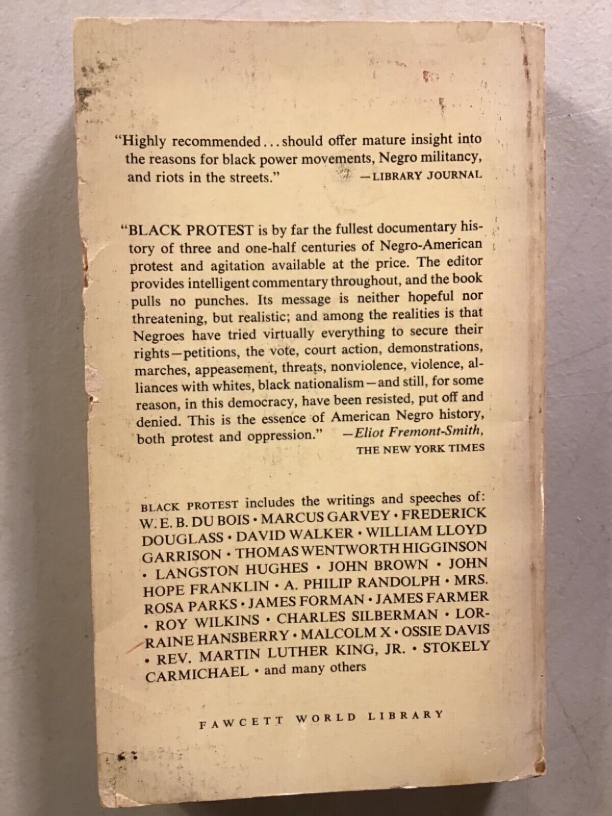 A collection of primary documents (not all by African American authors) and analyses (mostly by African American authors) of movements and episodes in black protest in the United States from the colonial era to the present (1968). A hybrid text, in part an anthology of primary materials (many of them relatively contemporary) and in part a collection of essays.