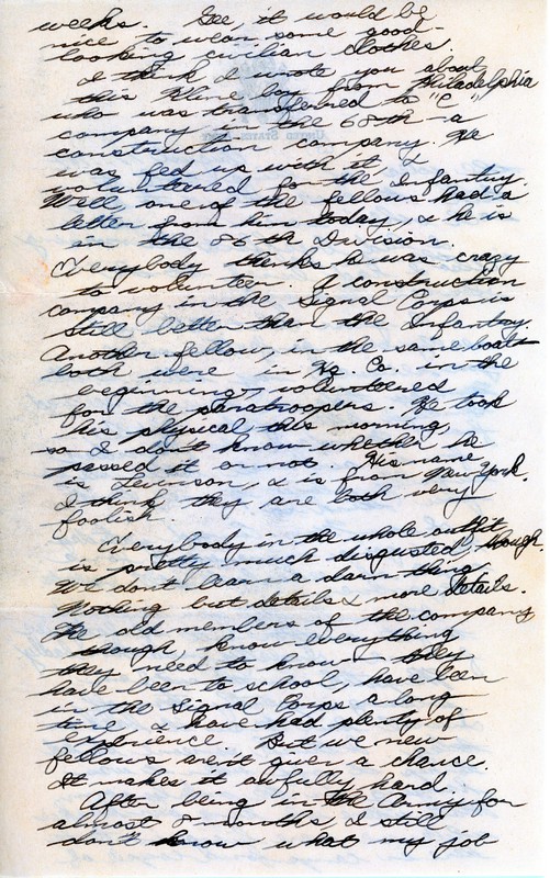 I think I wrote you about this Kline boy from Philadelphia who was transferred to “C” company in the 68th –a construction company. He was fed up with it, and volunteered for the Infantry. Well, one of the fellows had a letter from him today, and he is in the 86th Division. Everybody there thinks he was crazy to volunteer. A construction company in the Signal Corps is still better than the Infantry. Another fellow, in the same boat – both were in Hq. Co. in the beginning, volunteered for the paratroopers. He took his physical this morning, so I don’t know whether he passed it or not. His name is Levinson, and is from New York. I think they are both very foolish.