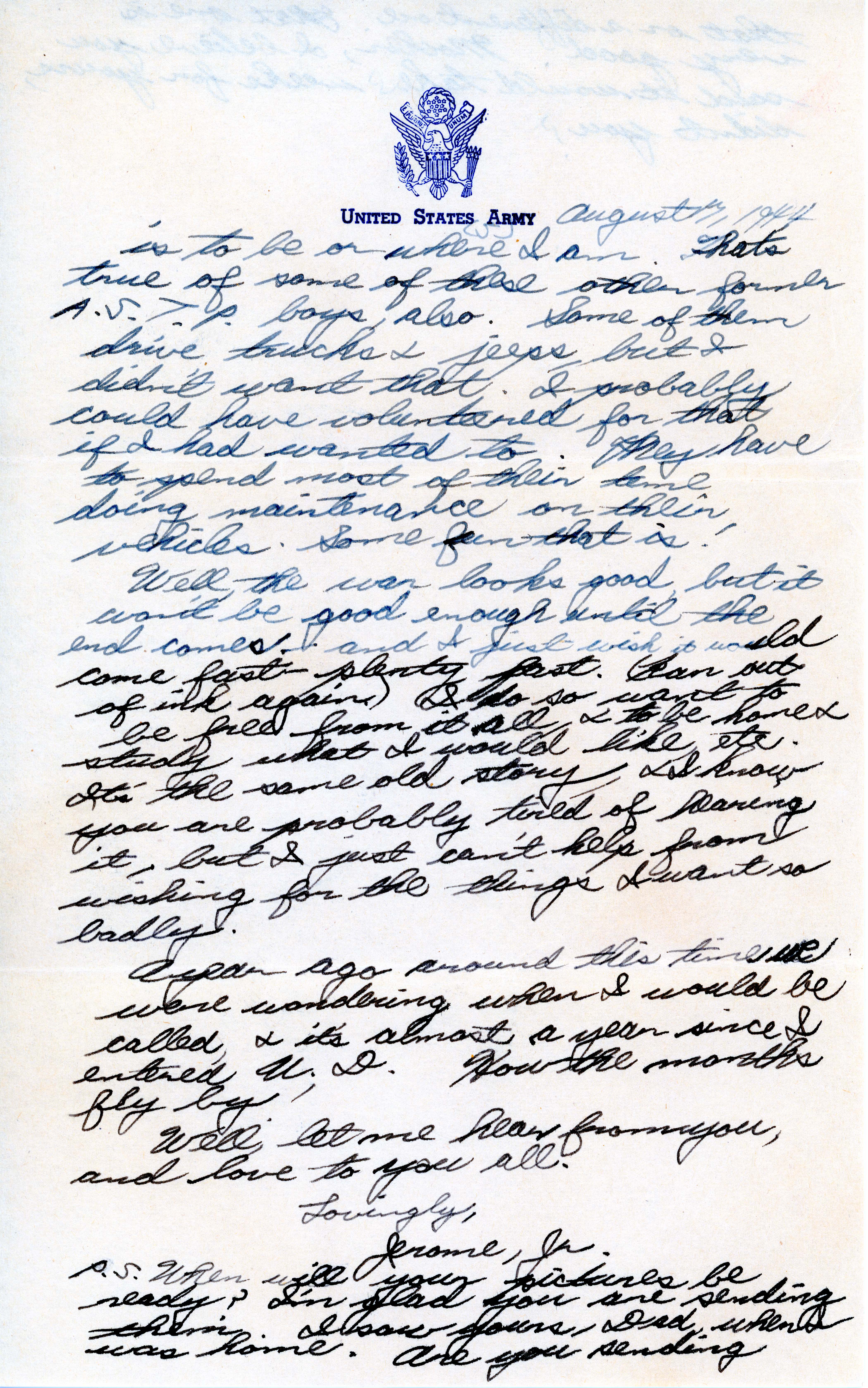 Well, the war looks good, but it won’t be good enough until the end comes and I just wish it would come fast – plenty fast. (Ran out of ink again) I do so want to be free from it all and to be home and study what I would like, etc. It’s the same old story, and I know you are probably tired of having it, but I just can’t help from wishing for the things I want so badly.