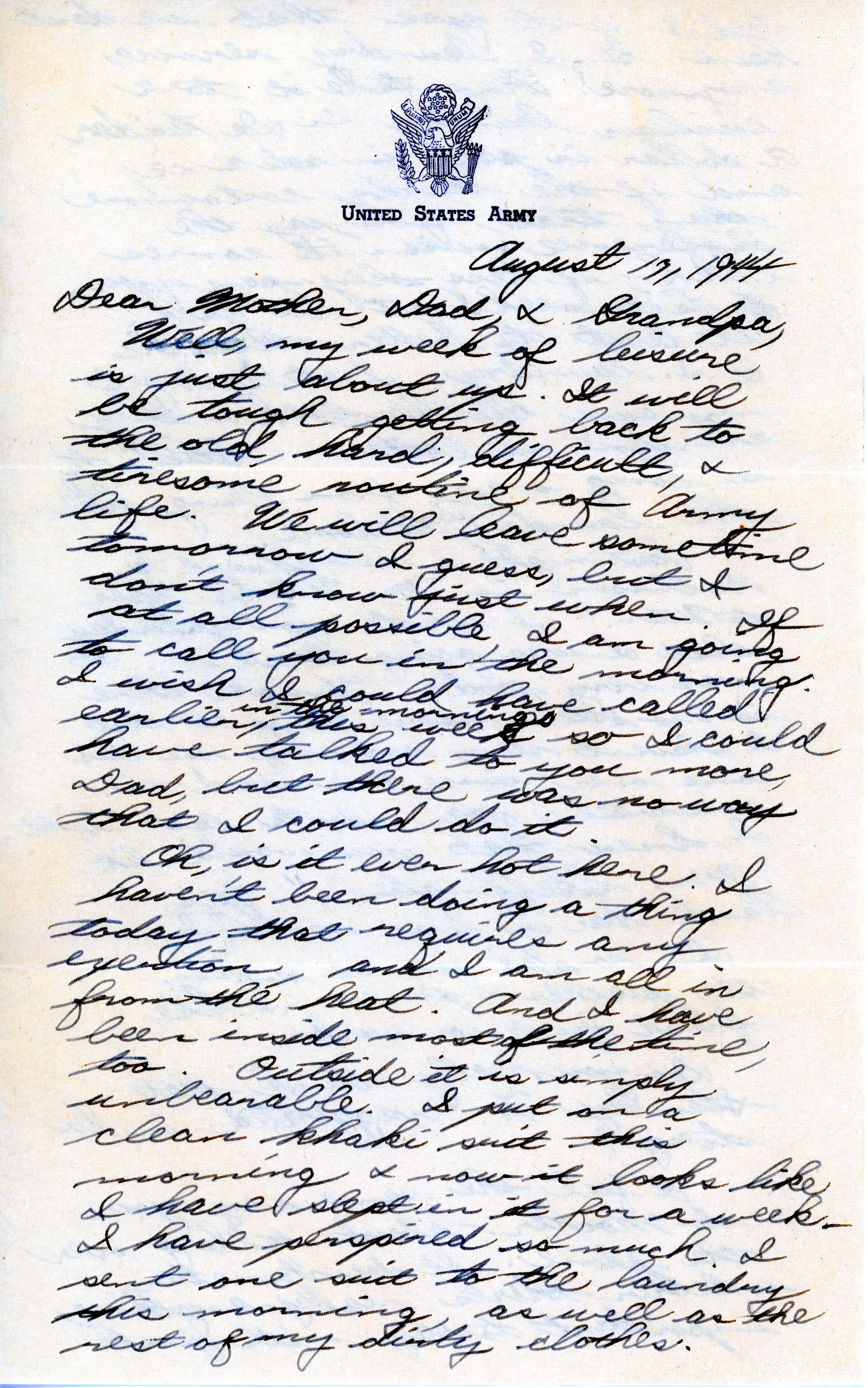 Well, my week of leisure is just about up. It will be tough getting back to the old, hard, difficult, and tiresome routine of Army life. We will leave sometime tomorrow I guess, but I don’t know just when. If at all possible I am going to call you in the morning. I wish I could have called earlier in the mornings this week so I could have talked to you more, Dad, but there was no way that I could do it.