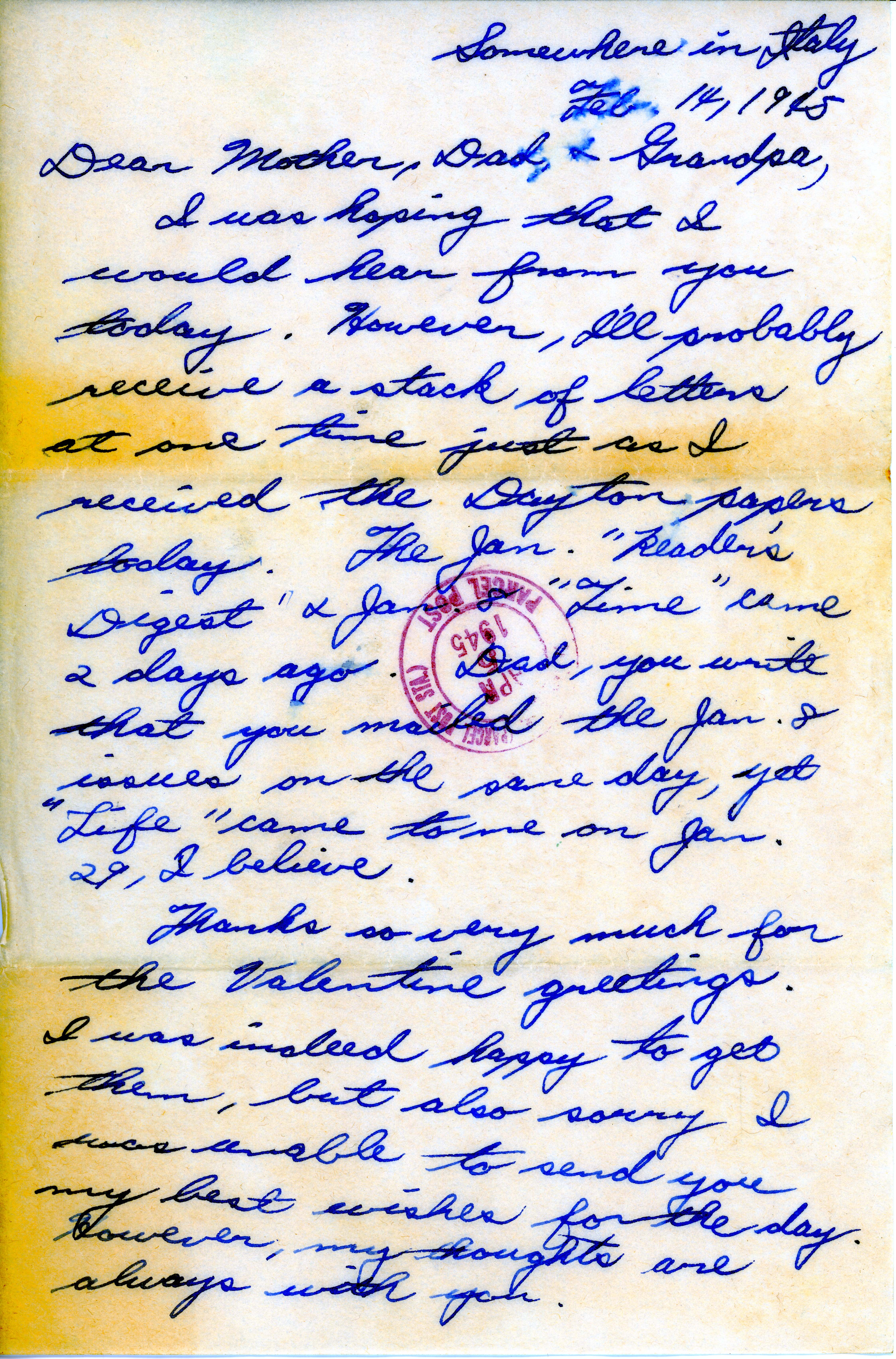 I was hoping that I would hear from you today. However, I’ll probably receive a stack of letters at one time just as I received the Dayton papers today. The Jan. “Reader’s Digest” and Jan. 8 “Time” came 2 days ago. Dad, you write that you mailed the Jan. 8 issues on the same day, yet “Life” came to me on Jan. 29, I believe.
