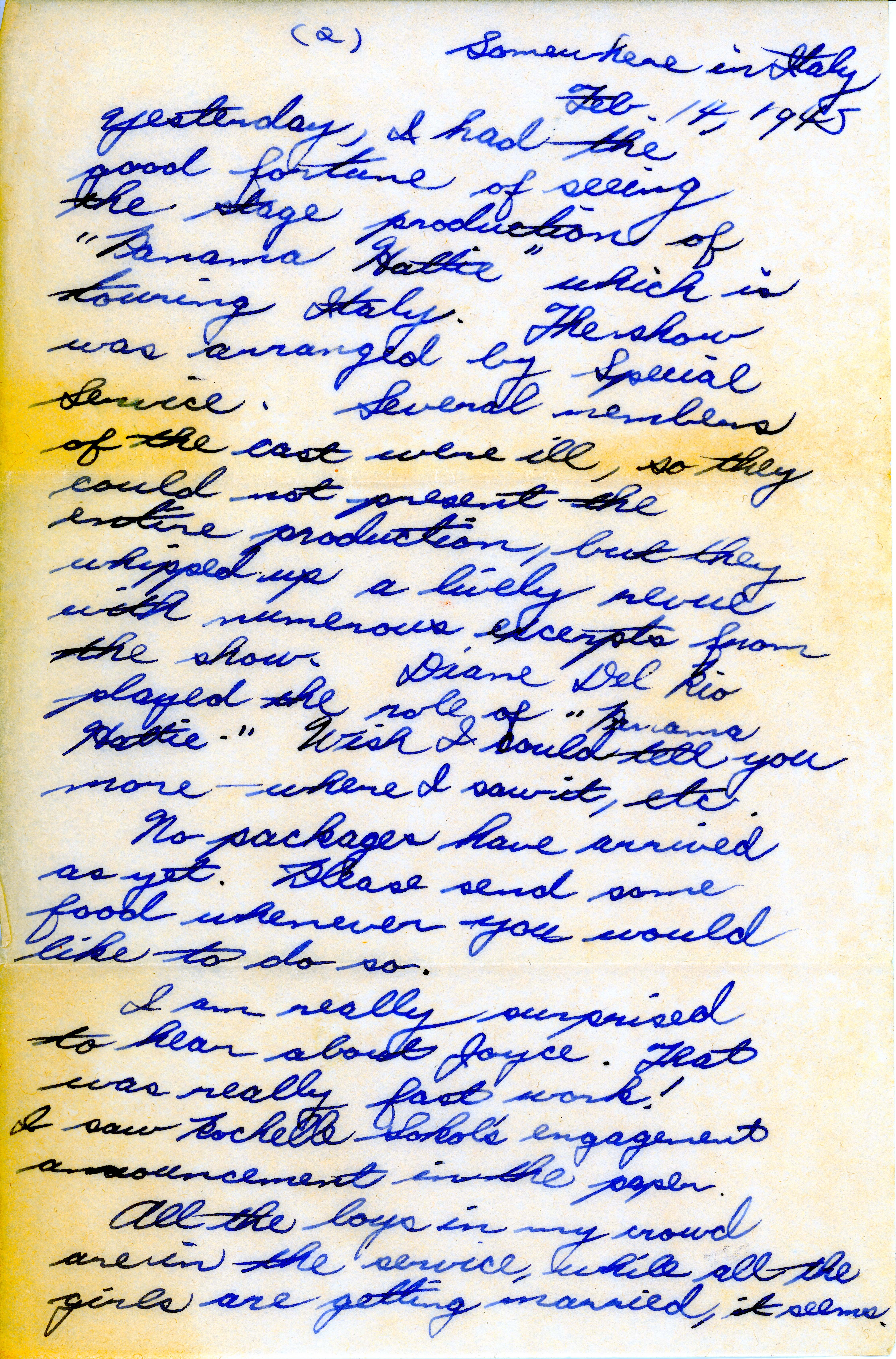 Yesterday, I had the good fortune of seeing the stage production of “Panama Hattie” which is touring Italy. The show was arraigned by Special Service. Several members of the cast were ill, so they could not present the entire production, but they whipped up a lively revue with numerous excerpts from the show. Diane Del Rio played the role of “Panama Hattie.” Wish I could tell you more—where I saw it, etc.