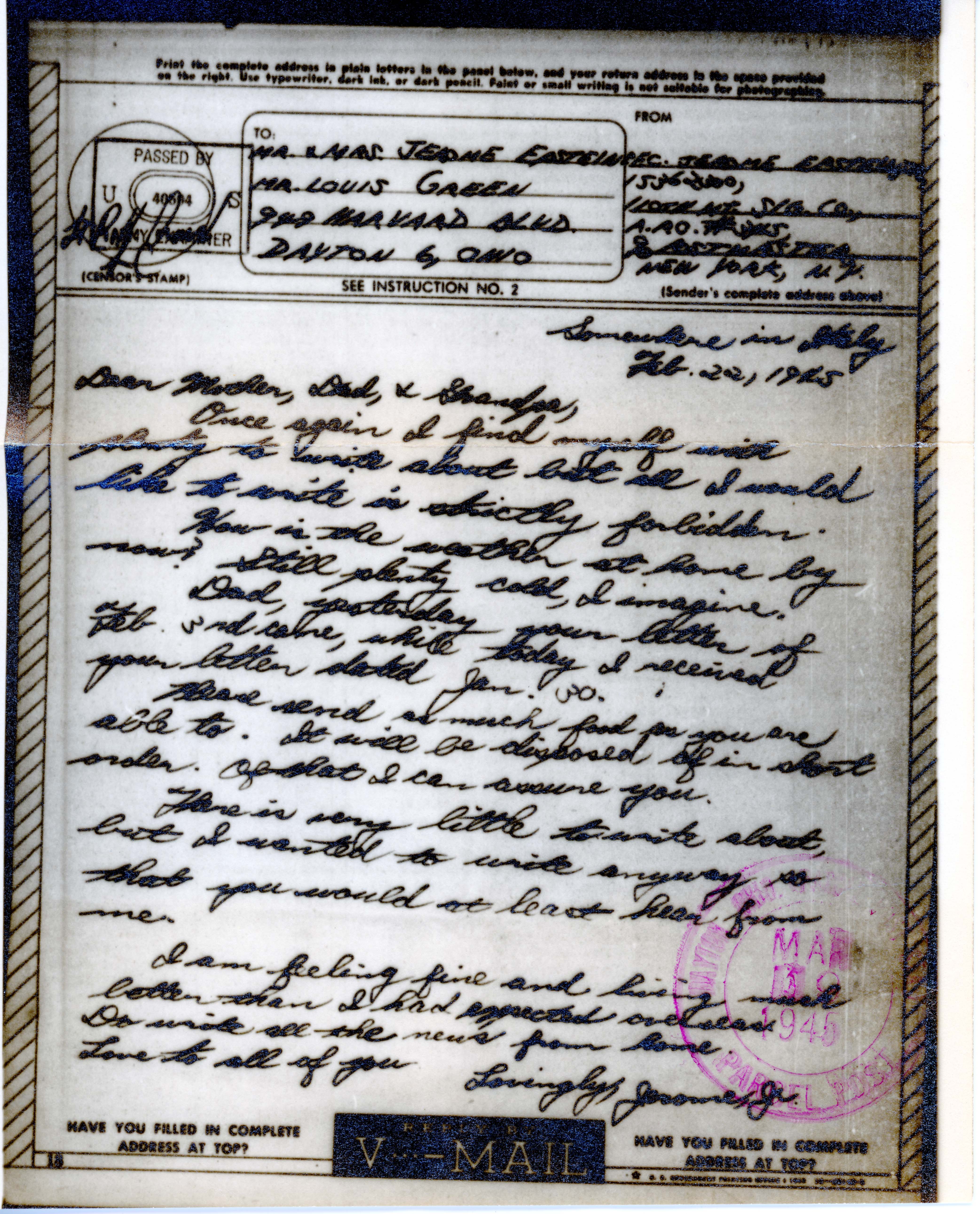 Letter from Jerome Epstein, Jr. to Mr. and Mrs. Jerome Epstein and Mr. Louis Green, dated February 22nd, 1945