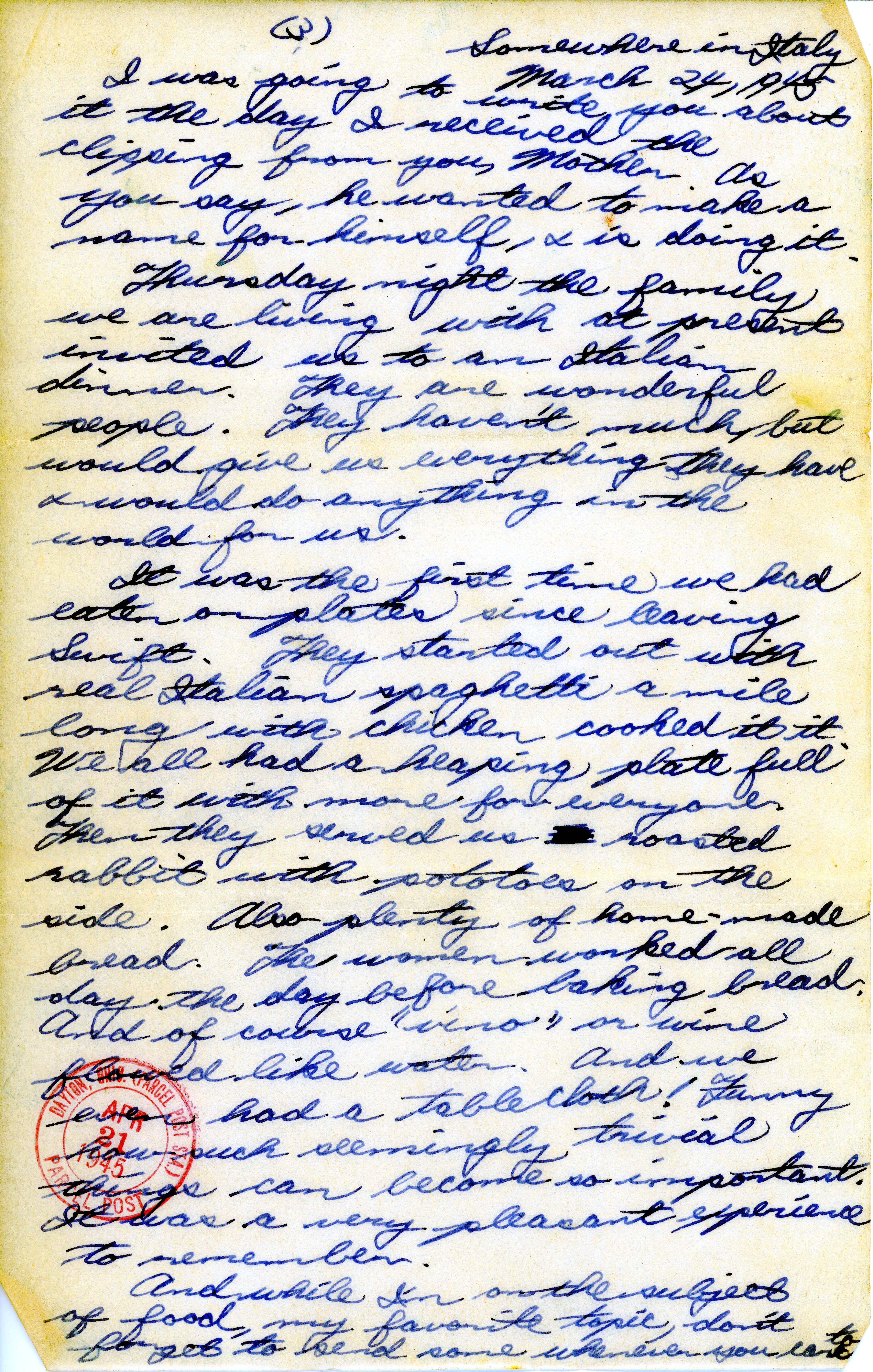 It was the first time we had eaten on plates since leaving Swift. The started out with real Italian spaghetti a mile long with chicken cooked it it [sic]. We all had a heaping plate full of it with more for everyone. Then they served us roasted [undecipherable] rabbit with potatoes on the side. Also plenty of home-made bread. The women worked all the day before baking bread. And of course “vino” or wine flowed like water. And we even had tablecloth! Funny how such seemingly trivial things can become so important. It was a very pleasant experience to remember.