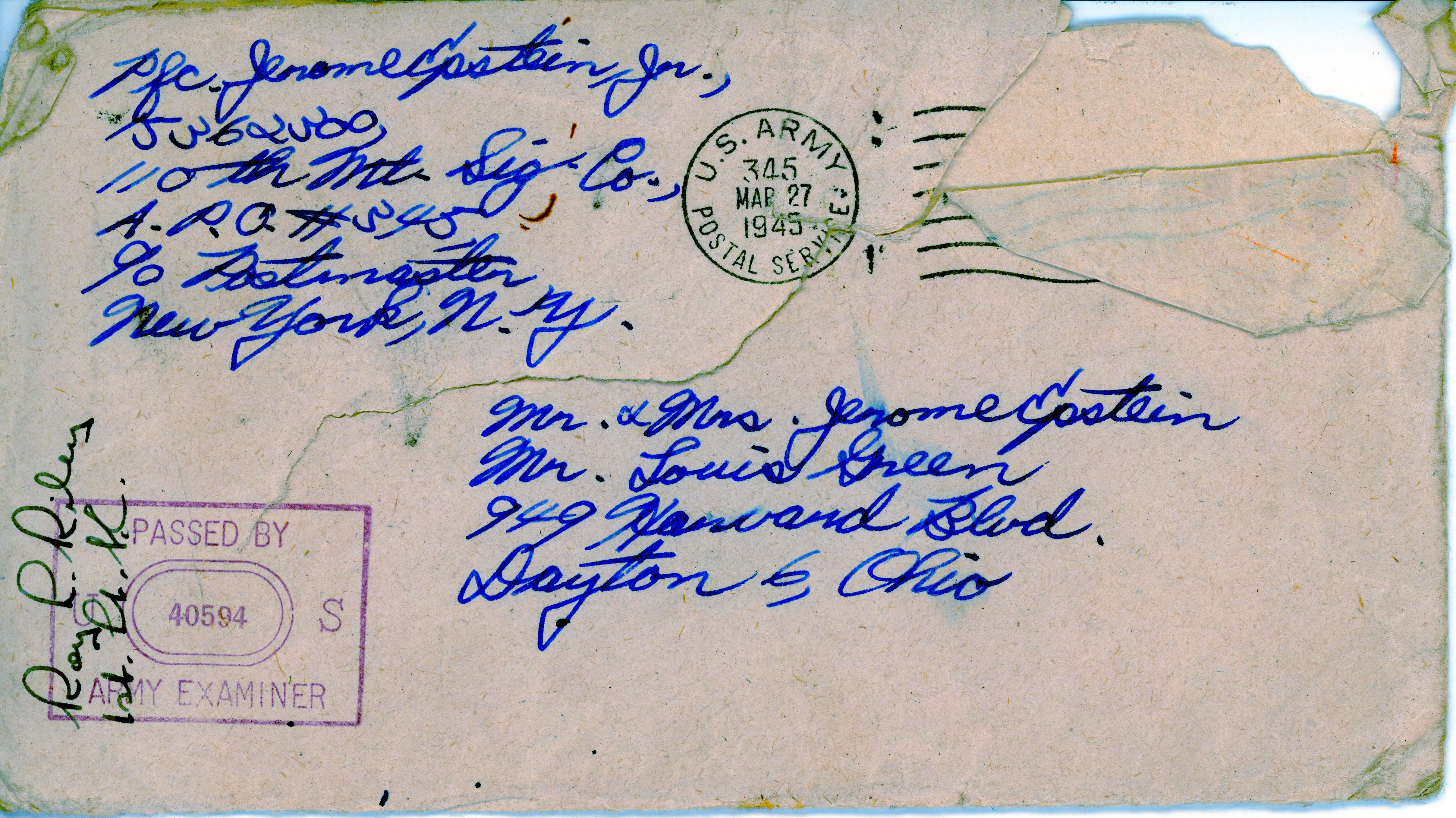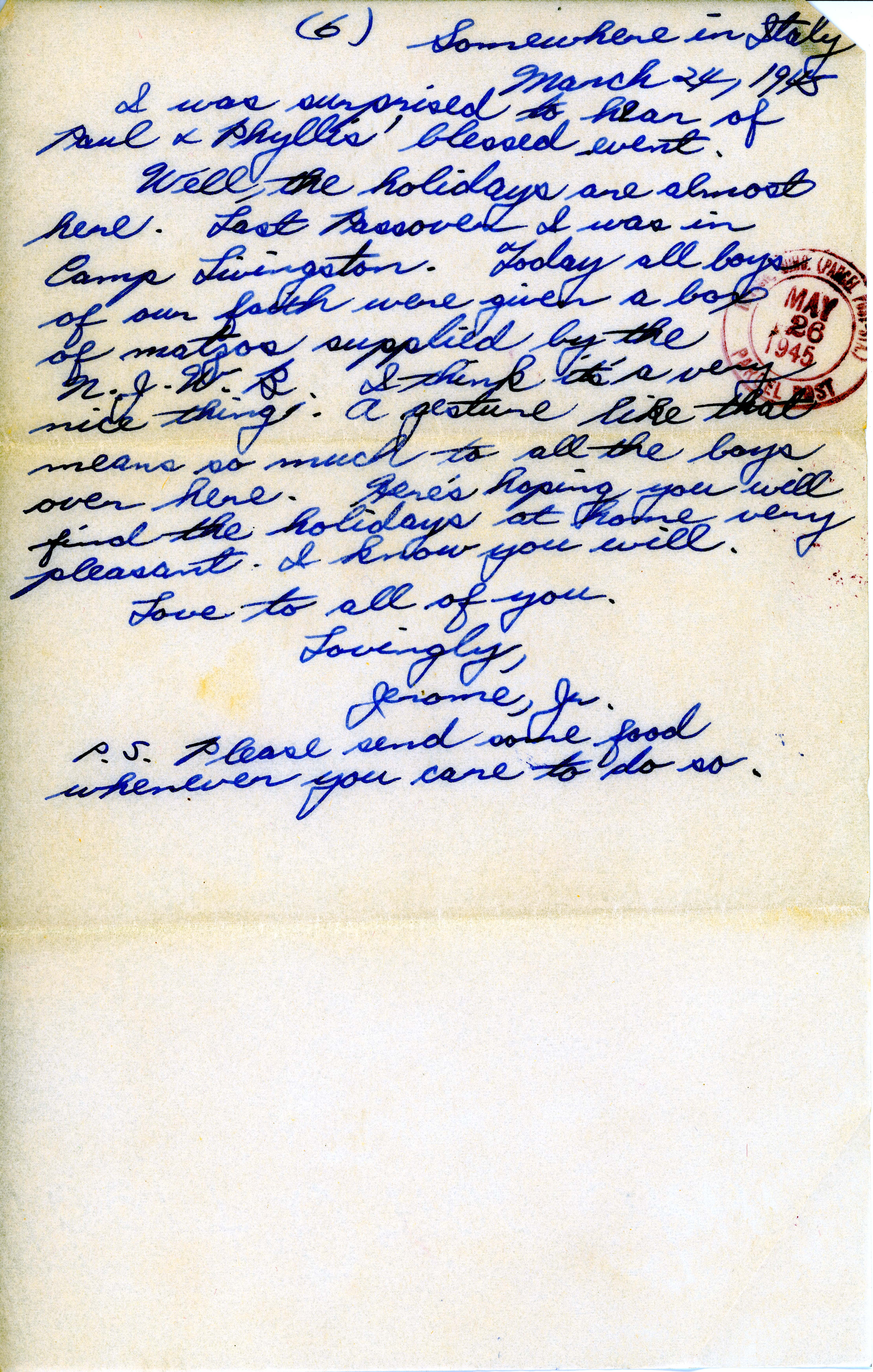 Well, the holidays are almost here. Last Passover I was in Camp Livingston. Today all boys of our faith were given a box of matzos supplied by the N.J.W.B. I think it’s a very nice thing. A gesture like that means so much to all the boys over here. Here’s hoping you will find the holidays at home very pleasant. I know you will.