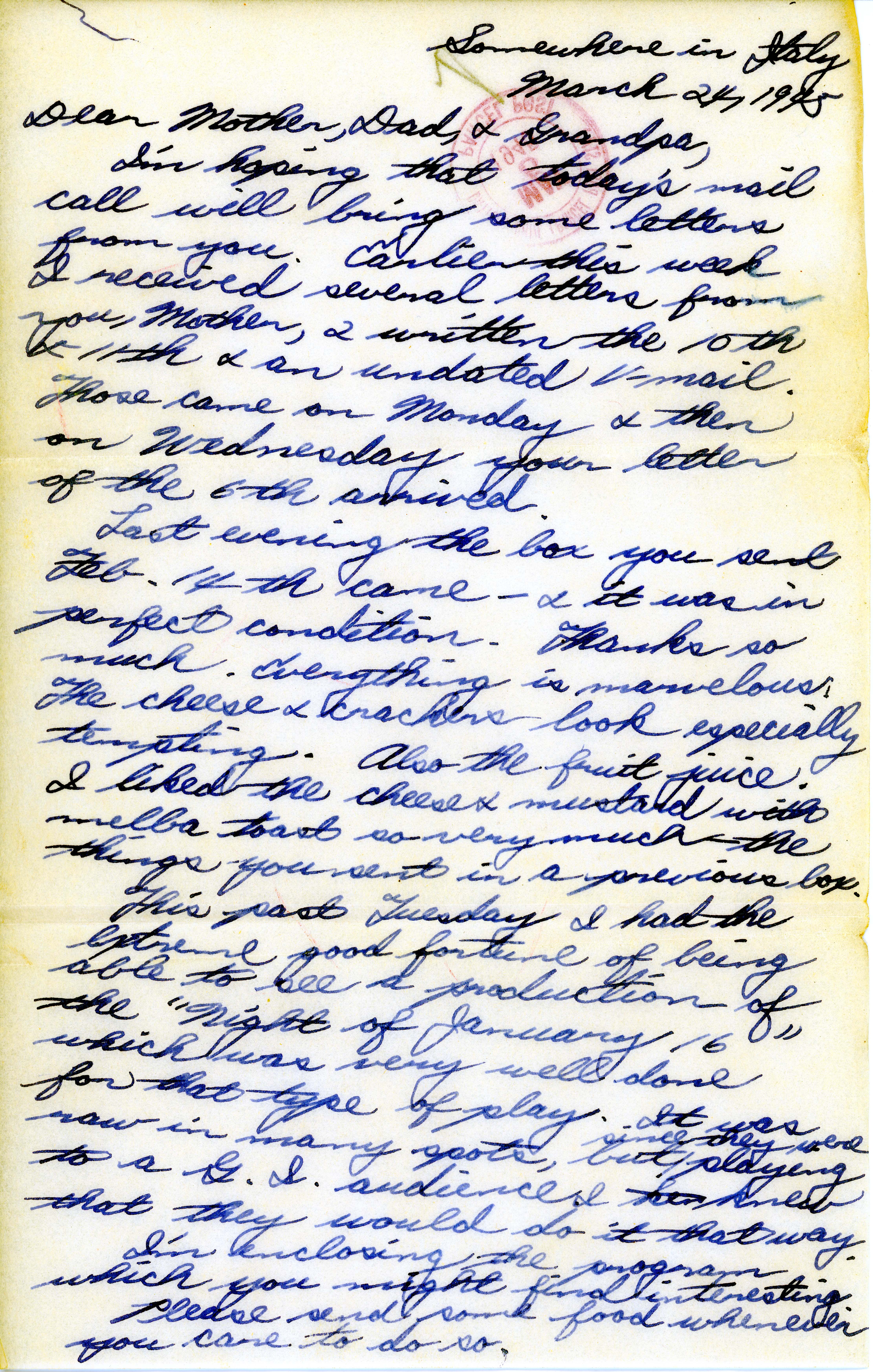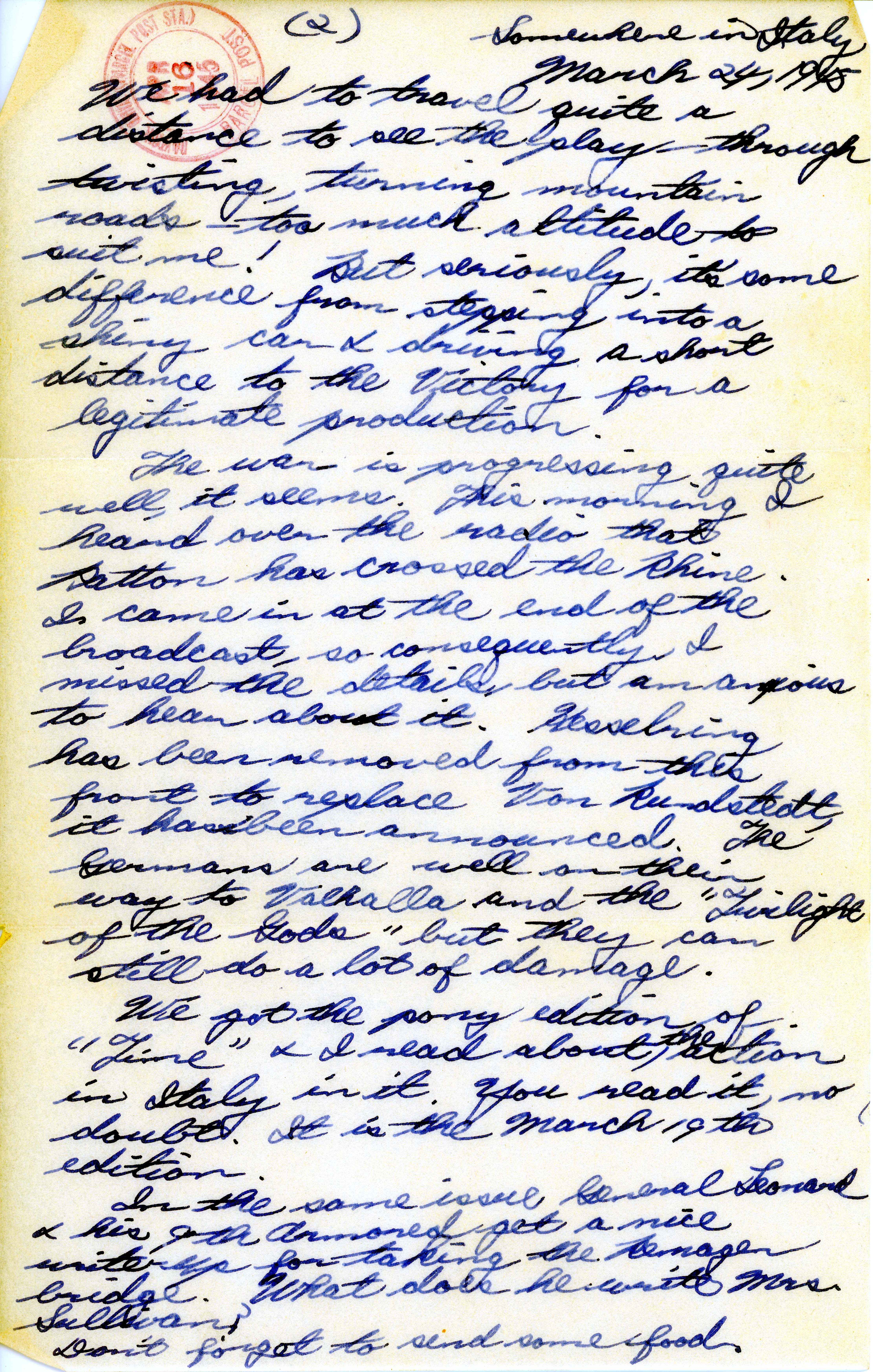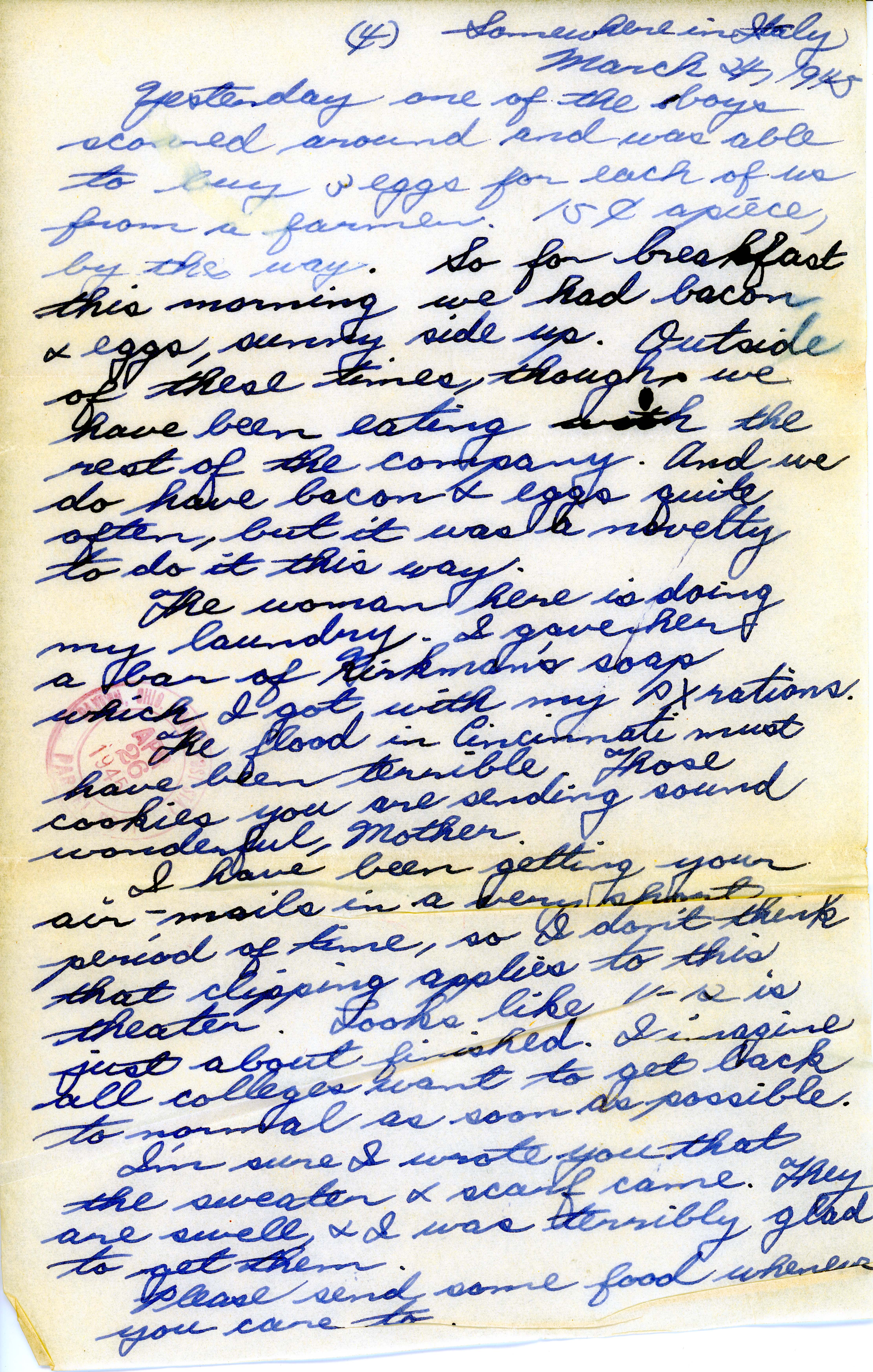 I’m hoping that today’s mail call will bring some letters from you. Earlier this week I received several letters from you, Mother, 2 written on the 10th and 11th and an undated V-mail. Those came on Monday and then on Wednesday your letter of the 6th arrived.