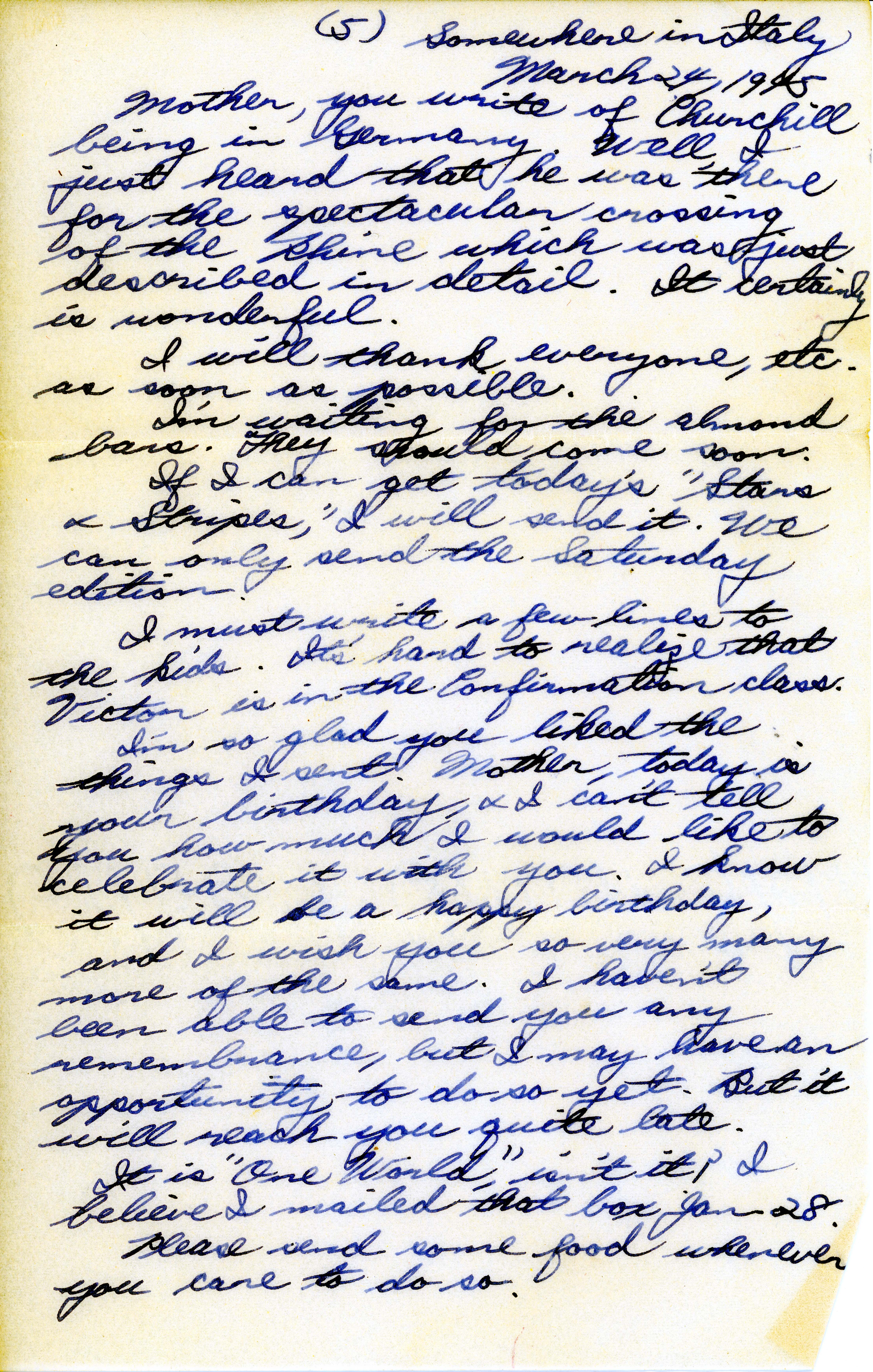 Mother, you write of Churchill being in Germany. Well I just heard that he was there for the spectacular crossing of the Rhine which was just described in detail. It certainly is wonderful.
