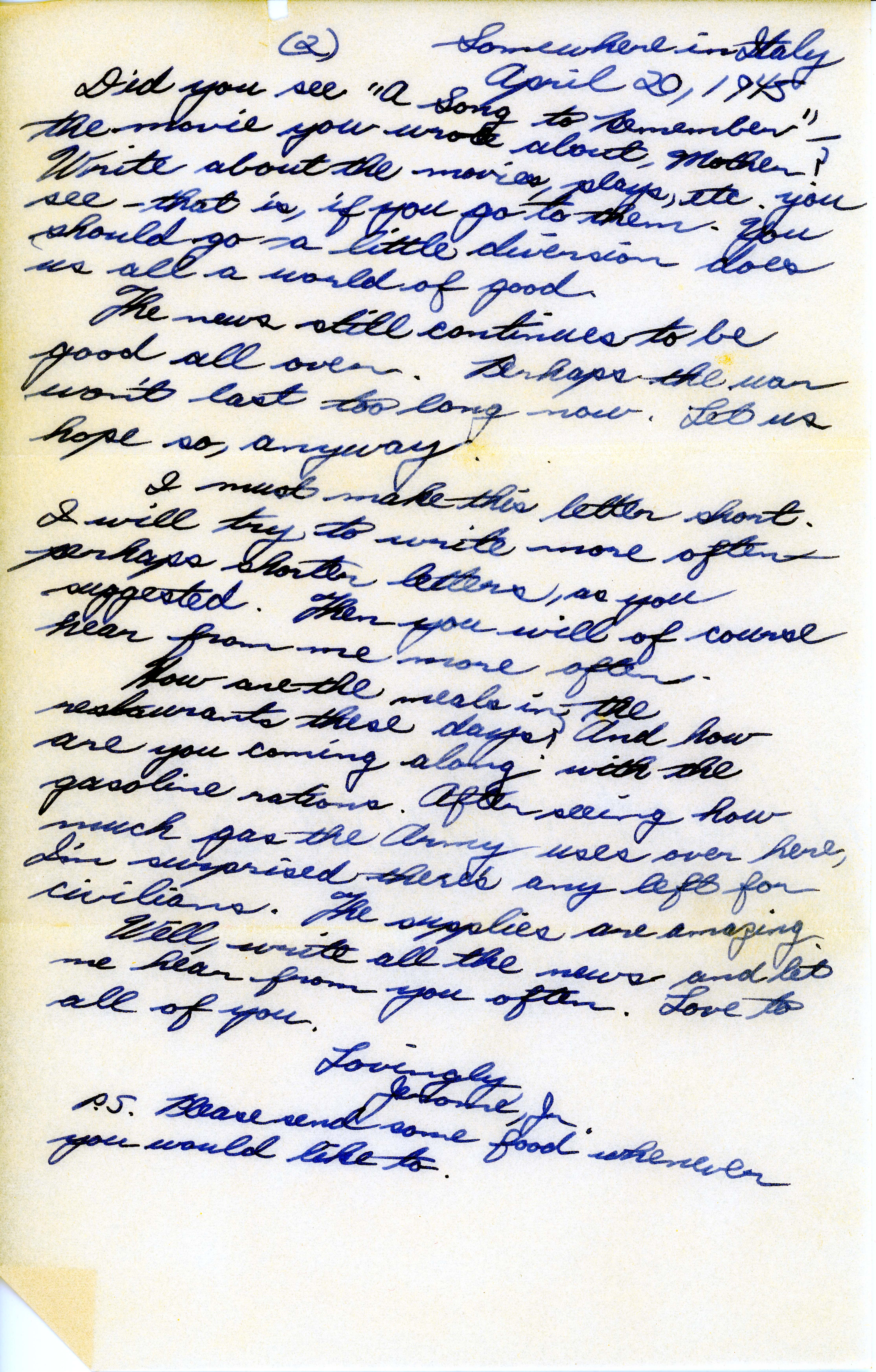Did you see “A Song to Remember” the movie you wrote about, Mother? Write about the movies, plays, etc. you see—that is, if you go to them. You should go—a little diversion does us all a world of good.
