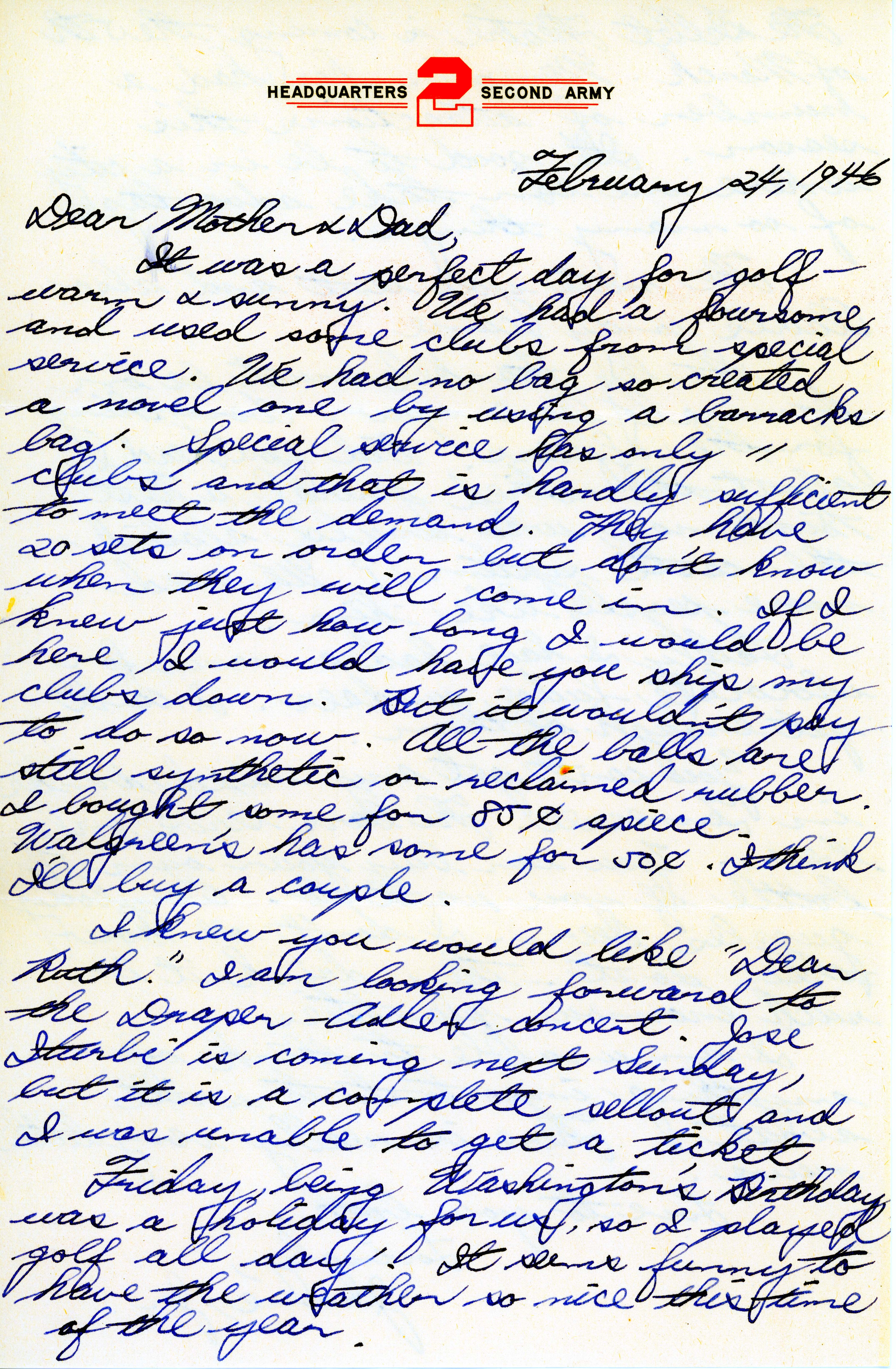 It was a perfect day for golf—warm and sunny. We had a foursome and used some clubs from special service. We had no bag so created a novel one by using a barracks bag. Special service has only 11 clubs and that is hardly sufficient to meet the demand. They have 20 sets on order but don’t know when they will come in. If I knew just how long I would be here I would have you ship my clubs down. But it wouldn’t pay to do so now. All the balls are still synthetic or reclaimed rubber. I bought some for 85₵ a piece. Walgreen’s has some for 50₵. I think I’ll buy a couple.