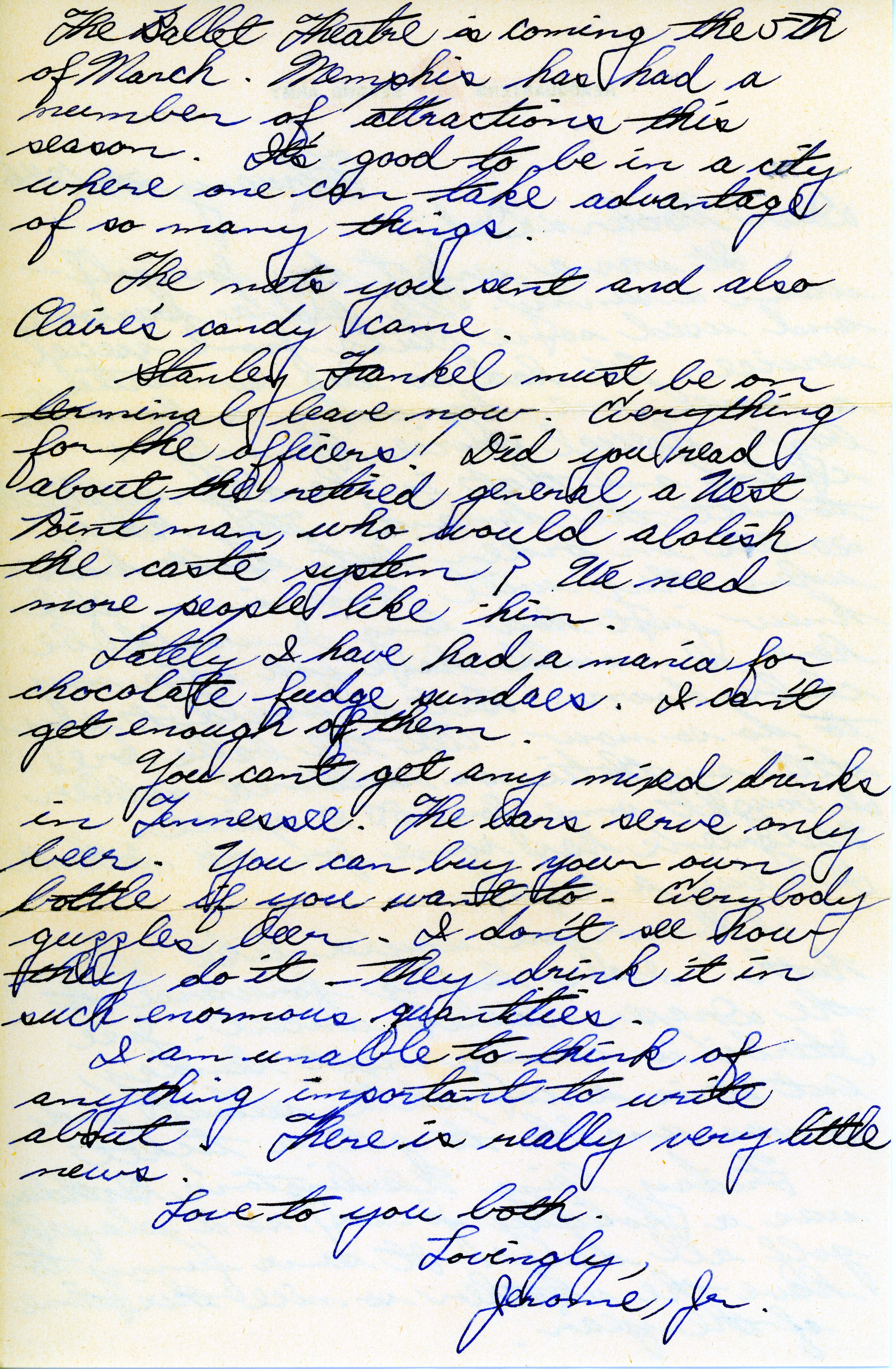 You can’t get any mixed drinks in Tennessee. The bars serve only beer. You can buy your own bottle if you want to. Everybody guzzles beer. I don’t see how they do it—they drink it in such enormous quantities.